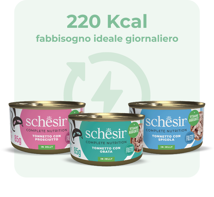 Scegliere una dieta totalmente umida, costituita da tre lattine al giorno, apporta circa 220 Kcal, che corrispondono al fabbisogno energetico ideale di un gatto adulto di peso medio 5kg.