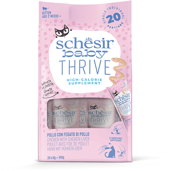Die Linie Baby Thrive von Schesir ist für Katzenbabys in der Wachstumsphase gedacht. Die spezielle Formel, die auch für ihre kleinen Zähne geeignet ist, ist in der Lage, ihnen Nährstoffe, Vitamine, Mineralien und Aminosäuren zuzuführen, um das Muskel- und Skelettwachstum zu unterstützen. Sie sind die perfekte Ergänzung der Diät der Kleinen, da sie sie mit den zusätzlichen Kalorien versorgt, die für ihre Bedürfnisse notwendig sind.