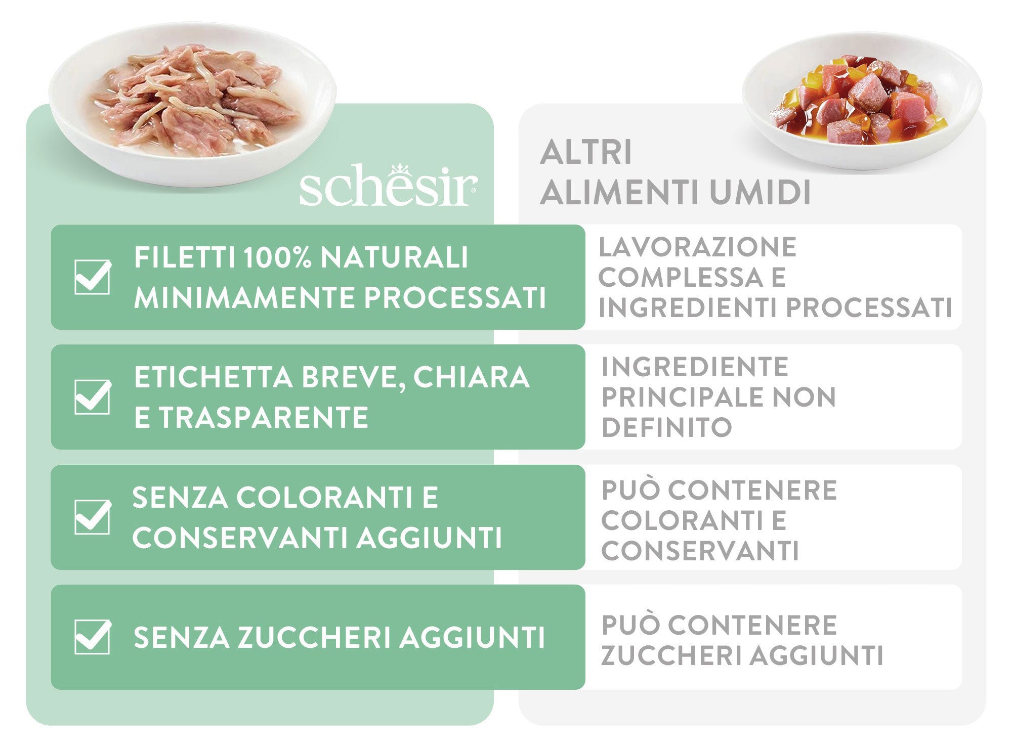 Ricette umide complementari a base di veri filetti di carne o pesce, sapientemente selezionati, e con liquidi extra in aggiunta, da abbinare a un elemento completo per un’alimentazione in linea con i bisogni naturali del gatto.