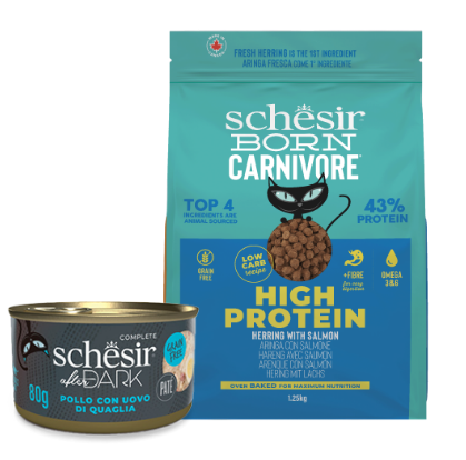 Con un elevado aporte proteico (≥43 %) y un bajo contenido de carbohidratos (≤12 %), lanueva línea Schesir Born Carnivore es el alimento perfecto para los verdaderos carnívoros.