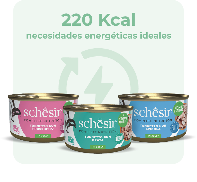 Una dieta totalmente húmeda de tres latas al día proporciona 220 kcal aproximadamente, que corresponden a las necesidades energéticas ideales de un gato adulto con un peso medio de 5 kg.