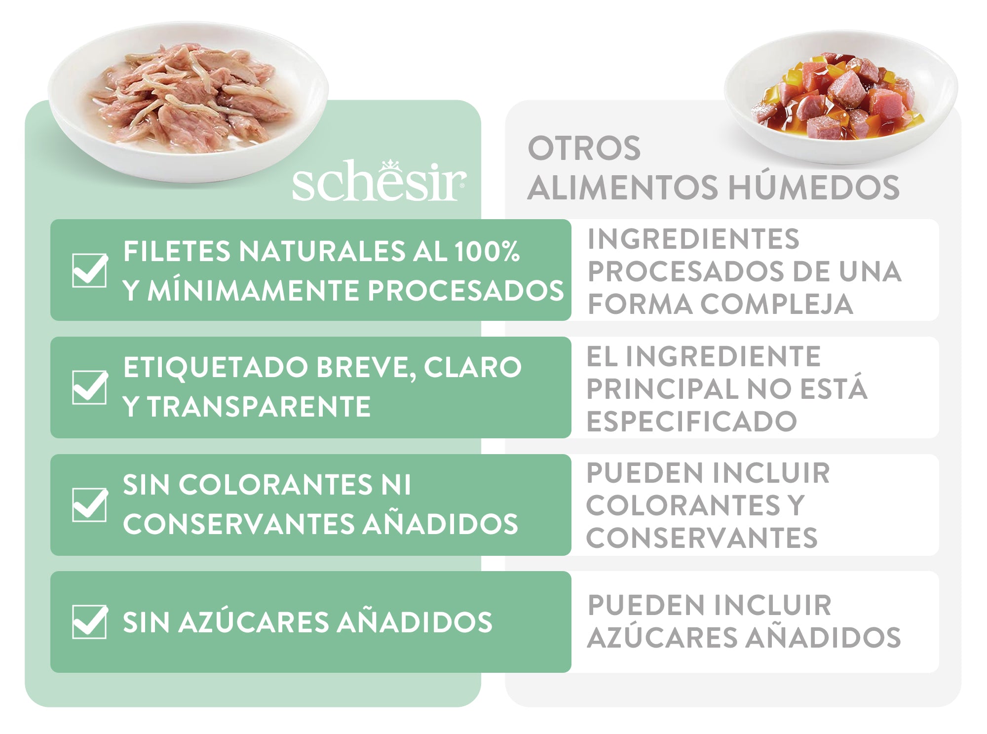 Recetas de alimentos húmedos nutricionalmente completas y equilibradas a base de carne o filetes de pescado reales cuidadosamente seleccionados, con líquidos adicionales enriquecidos con vitaminas y minerales para una dieta adaptada a las necesidades naturales de los gatos.
