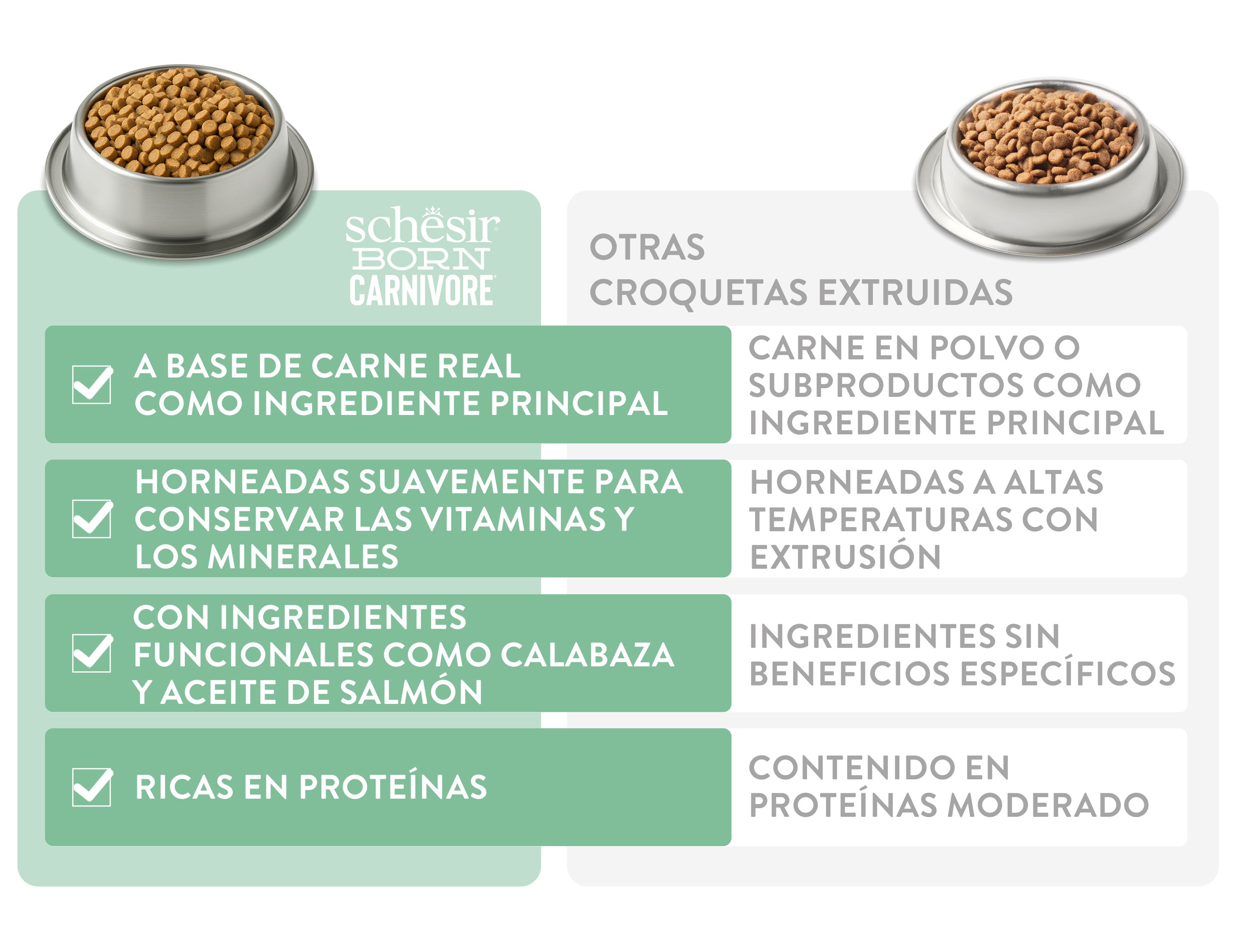 La calidad real se reconoce al instante. Croquetas elaboradas con carne real como ingrediente principal, horneadas a baja temperatura para conservar las vitaminas y los minerales. Textura natural y sabor intenso.