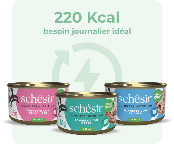 Une alimentation totalement humide de trois boîtes par jour fournit environ 220 kcal, ce qui correspond aux besoins énergétiques idéaux d’un chat adulte d’un poids moyen de 5 kg.